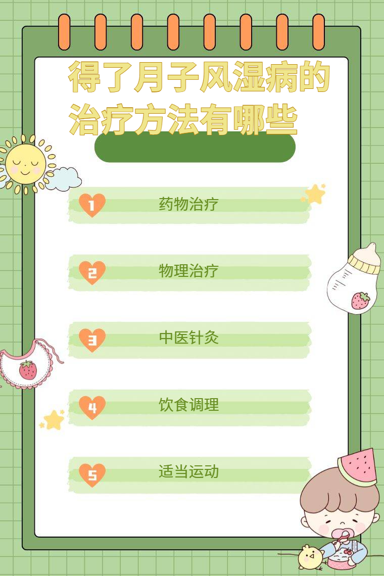 得了月子风湿病可通过药物治疗、物理治疗、中医针灸、饮食调理、适当运动等方法进行治疗。