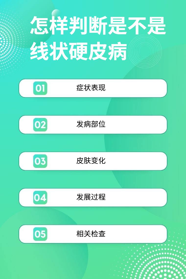 判断是否为线状硬皮病可从症状表现、发病部位、皮肤变化、发展过程、相关检查等方面入手。