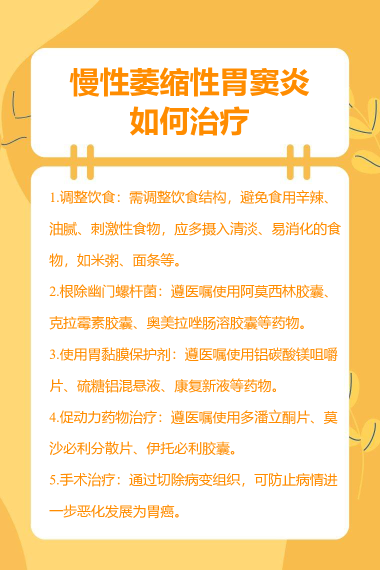5.手术治疗:对于少数伴有重度不典型增生或癌变倾向的慢性萎缩性胃窦炎患者,手术治疗是必要的选择。通过切除病变组织,可防止病情进一步恶化发展为胃癌。手术方式根据具体病情而定,术后需配合相应的康复治疗和定期复查,以提高患者的生存质量和预后效果。