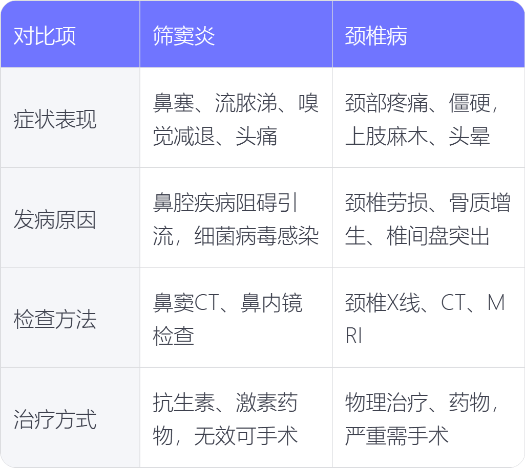 3. 检查方法:筛窦炎一般通过鼻窦CT检查,能清晰显示鼻窦内病变情况,还可结合鼻内镜检查直接观察鼻腔和鼻窦内部结构;颈椎病主要依靠颈椎X线、CT、MRI等检查,X线可观察颈椎骨质结构,CT能更清楚显示骨骼细节,MRI对脊髓、神经等软组织分辨力高,有助于明确病变部位和程度。