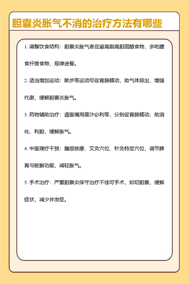 胆囊炎胀气不消的治疗方法有调整饮食结构、适当增加运动、药物辅助治疗、中医理疗干预、手术治疗等。