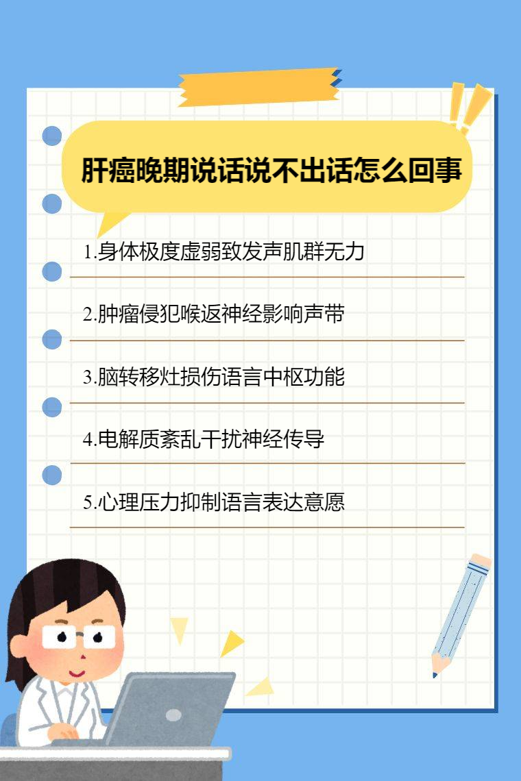 肝癌晚期说不出话可能是由于病情严重导致身体极度虚弱、肿瘤侵犯压迫神经、脑转移、电解质紊乱、精神心理因素等。