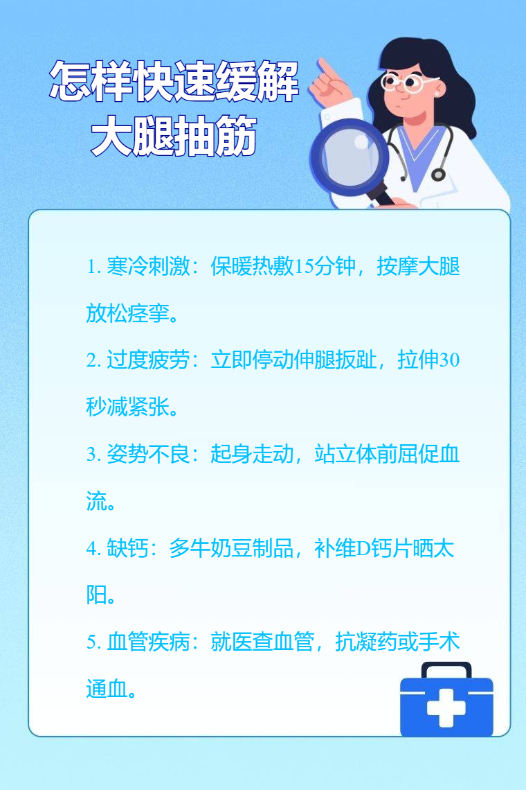 大腿抽筋可能是寒冷刺激、过度疲劳、姿势不良、缺钙、血管疾病等因素,需要针对病因治疗,可采取的方法有保暖、休息、调整姿势、补钙、治疗血管疾病等。
