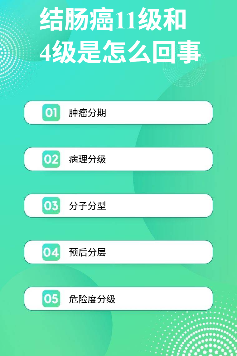 结肠癌11级和4级可能涉及分期、分级等情况,常见的有肿瘤分期、病理分级、分子分型、预后分层、危险度分级等。