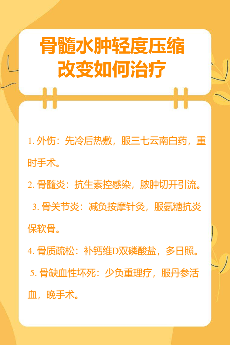 骨髓水肿轻度压缩改变可能是外伤、骨髓炎、骨关节炎、骨质疏松、骨缺血性坏死等因素,需要针对病因治疗,可采取的方法有药物治疗、物理治疗、手术治疗等。