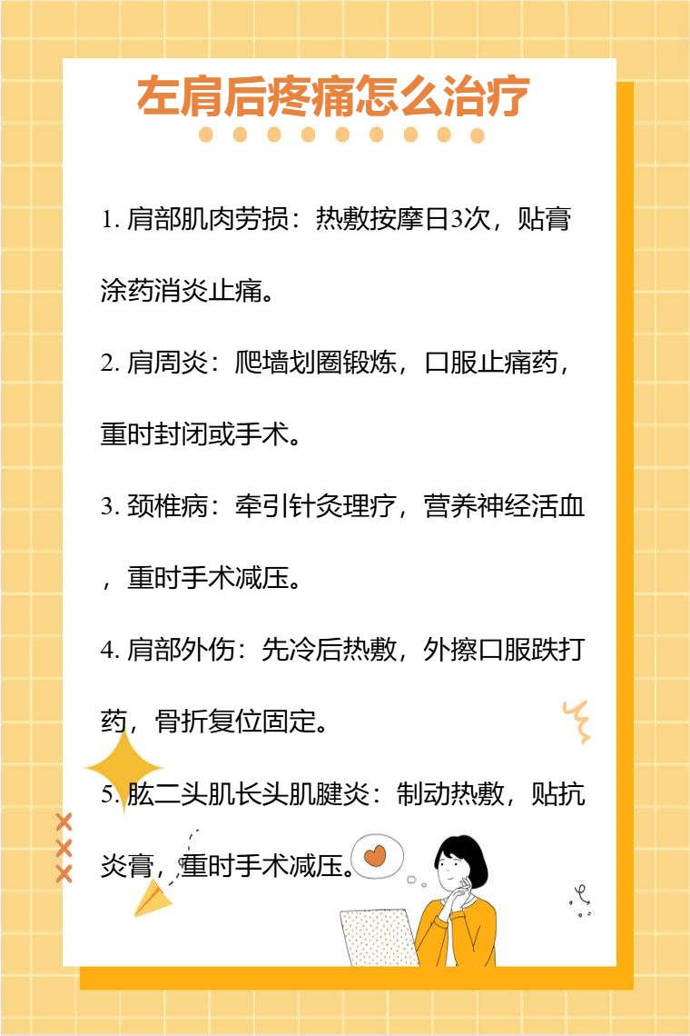 左肩后疼痛可能是肩部肌肉劳损、肩周炎、颈椎病、肩部外伤、肱二头肌长头肌腱炎等因素,需要针对病因治疗,可采取的方法有物理治疗、药物治疗、手术治疗等。