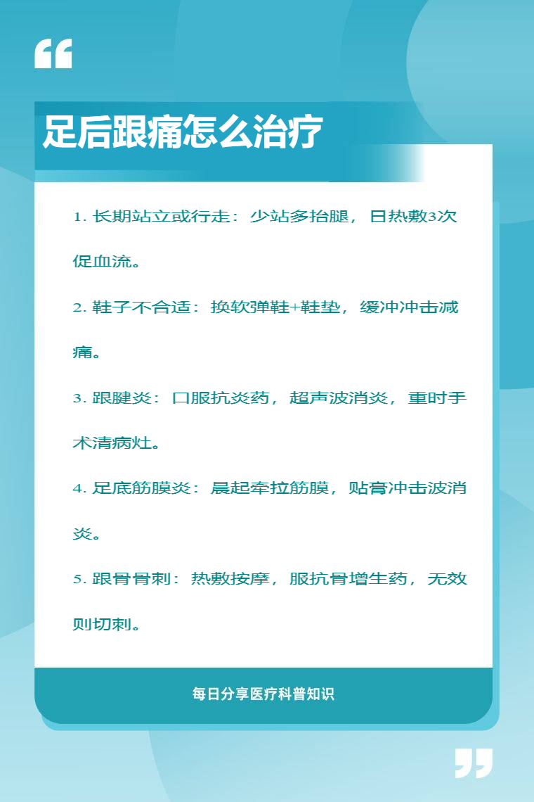 足跟痛可能是长期站立或行走、鞋子不合适、跟腱炎、足底筋膜炎、跟骨骨刺等因素,需要针对病因治疗,可采取的方法有休息、更换合适鞋子、药物治疗、物理治疗、手术治疗等。