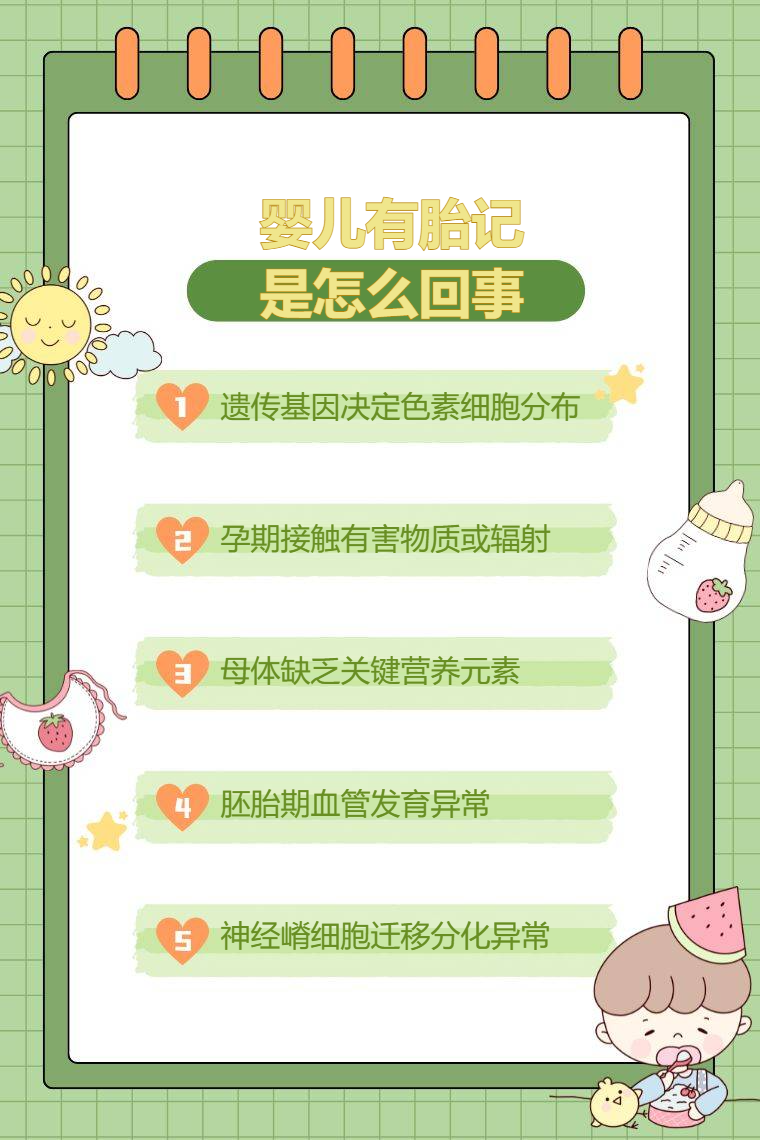 婴儿有胎记通常是由遗传因素、环境因素、孕期营养缺乏、血管异常、胚胎发育异常等情况导致。