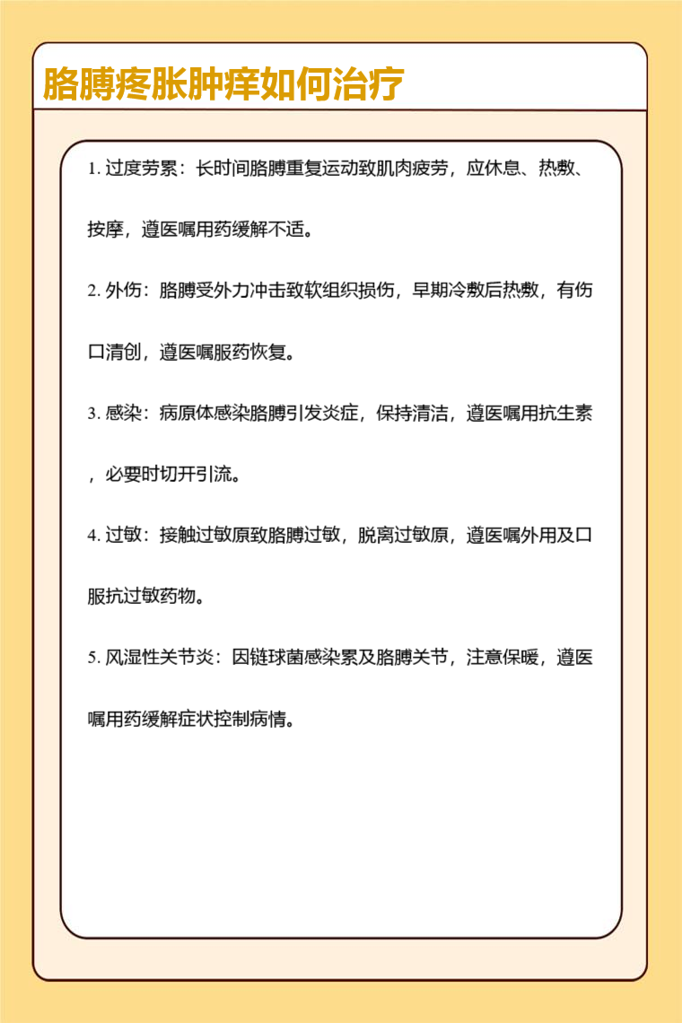 胳膊疼胀肿痒可能是过度劳累、外伤、感染、过敏、风湿性关节炎等因素,需要针对病因治疗,可采取的方法有休息、药物治疗、物理治疗等。