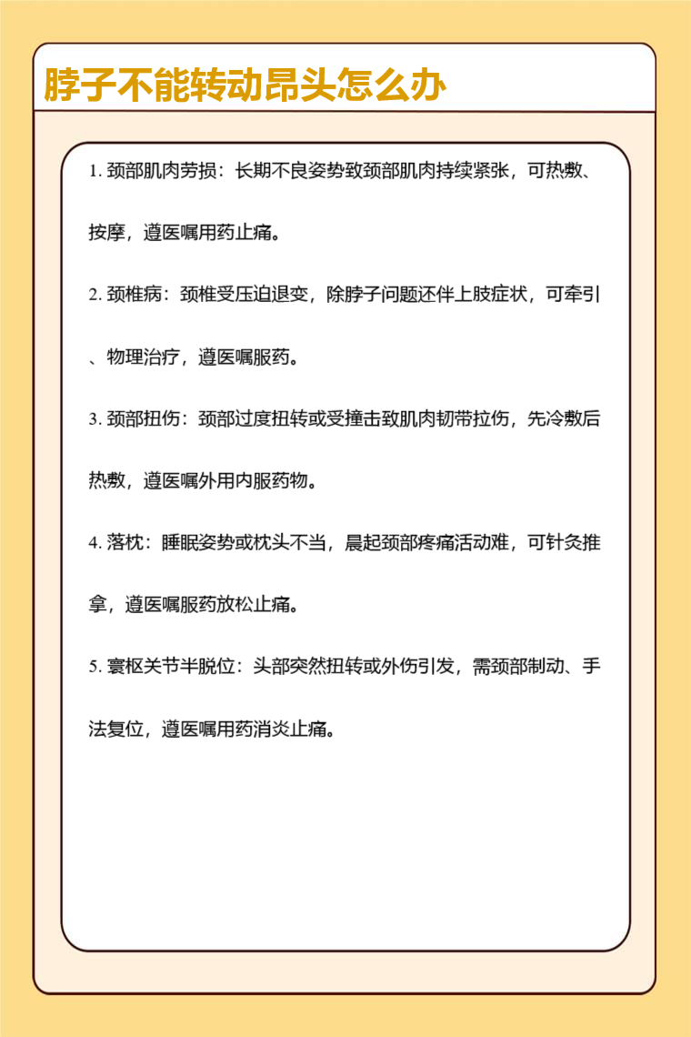 脖子不能转动昂头可能是颈部肌肉劳损、颈椎病、颈部扭伤、落枕、寰枢关节半脱位等因素,需要针对病因治疗,可采取的方法有物理治疗、药物治疗等。