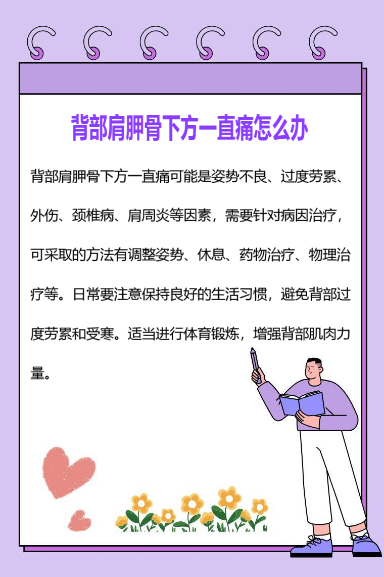 背部肩胛骨下方一直痛可能是姿势不良、过度劳累、外伤、颈椎病、肩周炎等因素,需要针对病因治疗,可采取的方法有调整姿势、休息、药物治疗、物理治疗等。