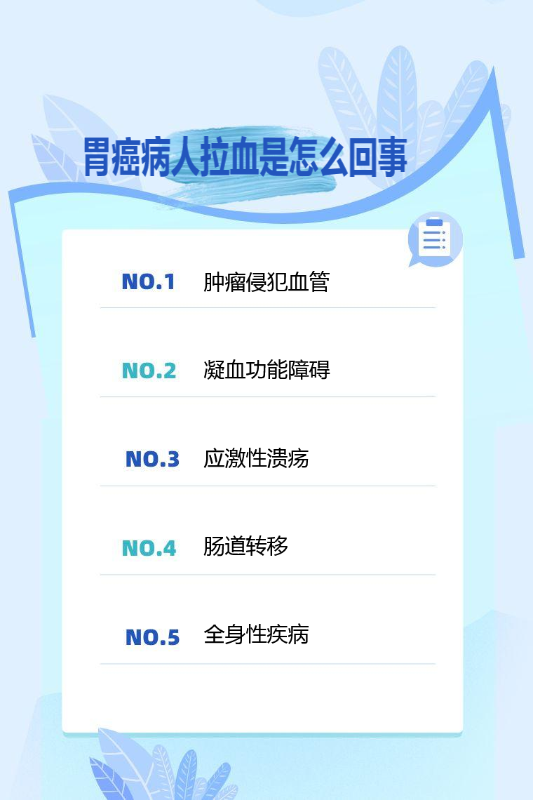 2. 凝血功能障碍:胃癌患者由于疾病本身影响,或在治疗过程中,比如化疗等,可能导致骨髓抑制,影响血小板生成,使凝血因子减少,从而出现凝血功能障碍,容易引起消化道出血,表现为拉血。