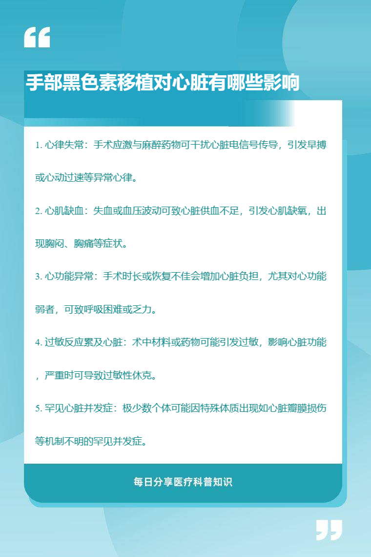 手部黑色素移植可能带来心律失常、心肌缺血、心功能异常、过敏反应累及心脏、罕见心脏并发症等影响。