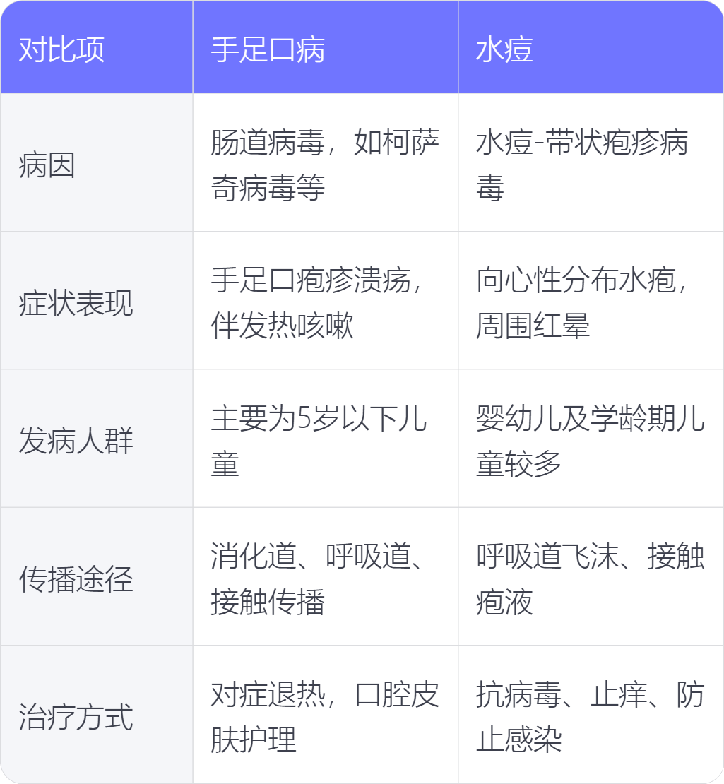 3. 发病人群:手足口病主要集中在5岁以下儿童;水痘可发生于任何年龄,但以婴幼儿和学龄前、学龄期儿童发病较多。