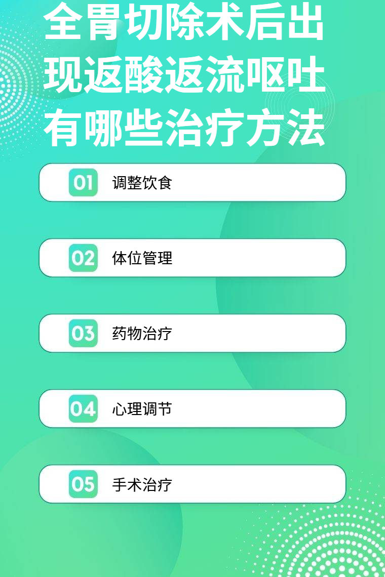 5. 手术治疗:若保守治疗效果不佳,可考虑手术治疗。对于全胃切除术后返酸返流呕吐,可通过手术重建消化道结构,如Roux-en-Y吻合术等,改变胃肠的生理通道,减少胆汁、胃酸等反流至食管,从而有效缓解返酸返流呕吐症状,但手术有一定风险,需谨慎评估。