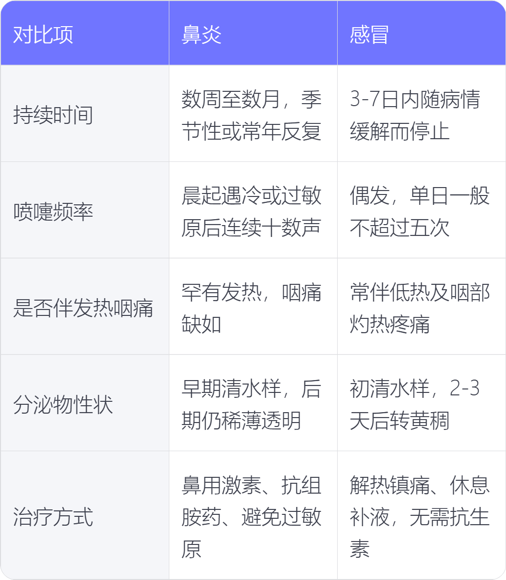 鼻炎与感冒在流涕持续时间、喷嚏发作频率、是否伴发热咽痛、分泌物性状差异及治疗方式五方面可资鉴别。
