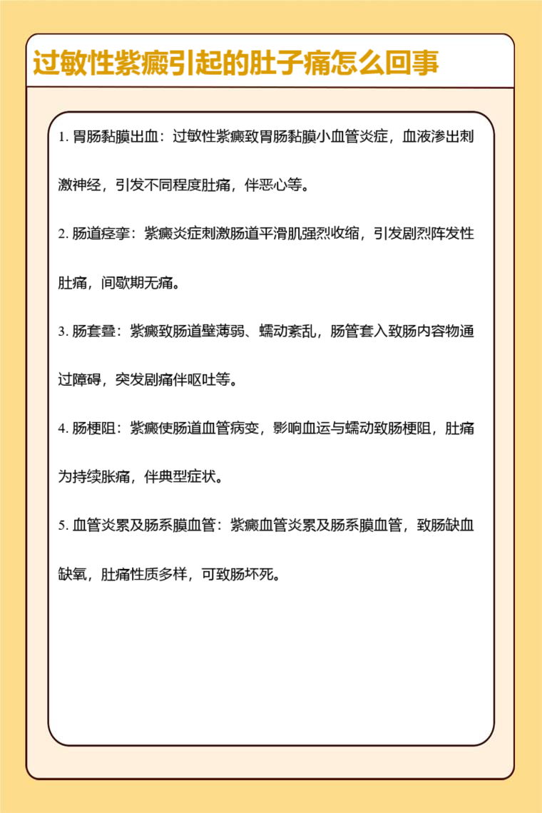 5. 血管炎累及肠系膜血管:过敏性紫癜本质是一种血管炎,当炎症累及肠系膜血管时,会导致肠系膜血管狭窄、堵塞,影响肠道血液供应,引起肠缺血、缺氧,产生肚子痛,疼痛性质多样,严重时可出现肠坏死等严重并发症。