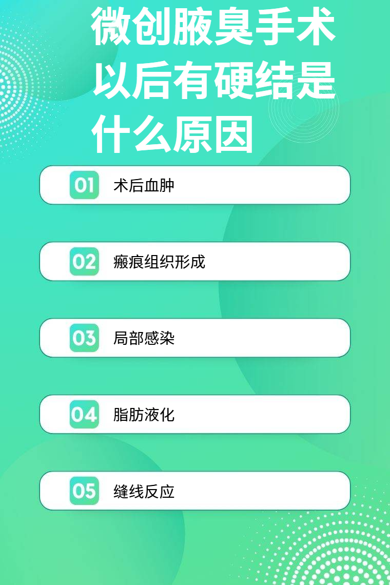 微创腋臭手术以后有硬结的原因包括术后血肿、瘢痕组织形成、局部感染、脂肪液化、缝线反应等。
