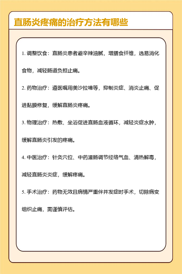 直肠炎疼痛的治疗方法有调整饮食、药物治疗、物理治疗、中医治疗、手术治疗等。