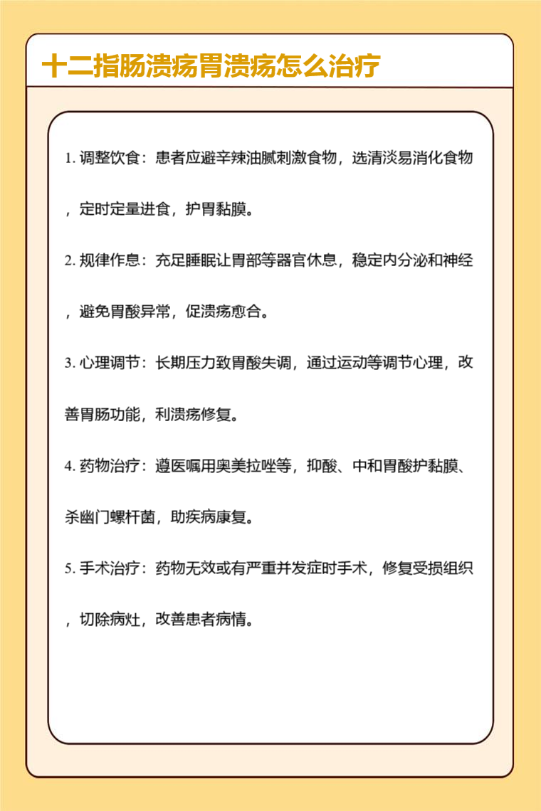 十二指肠溃疡和胃溃疡的治疗方法主要有调整饮食、规律作息、心理调节、药物治疗、手术治疗等。