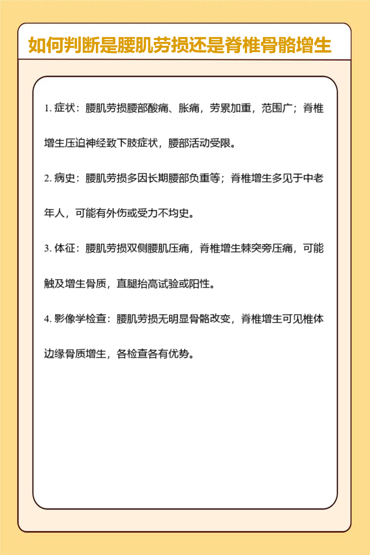 判断是腰肌劳损还是脊椎骨骼增生可从症状、病史、体征、影像学检查等方面入手。