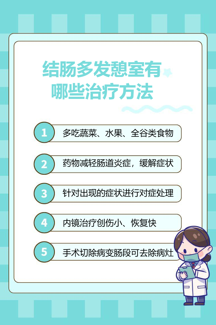 结肠多发憩室的治疗方法有饮食调整、药物治疗、对症支持治疗、内镜治疗、手术治疗等。