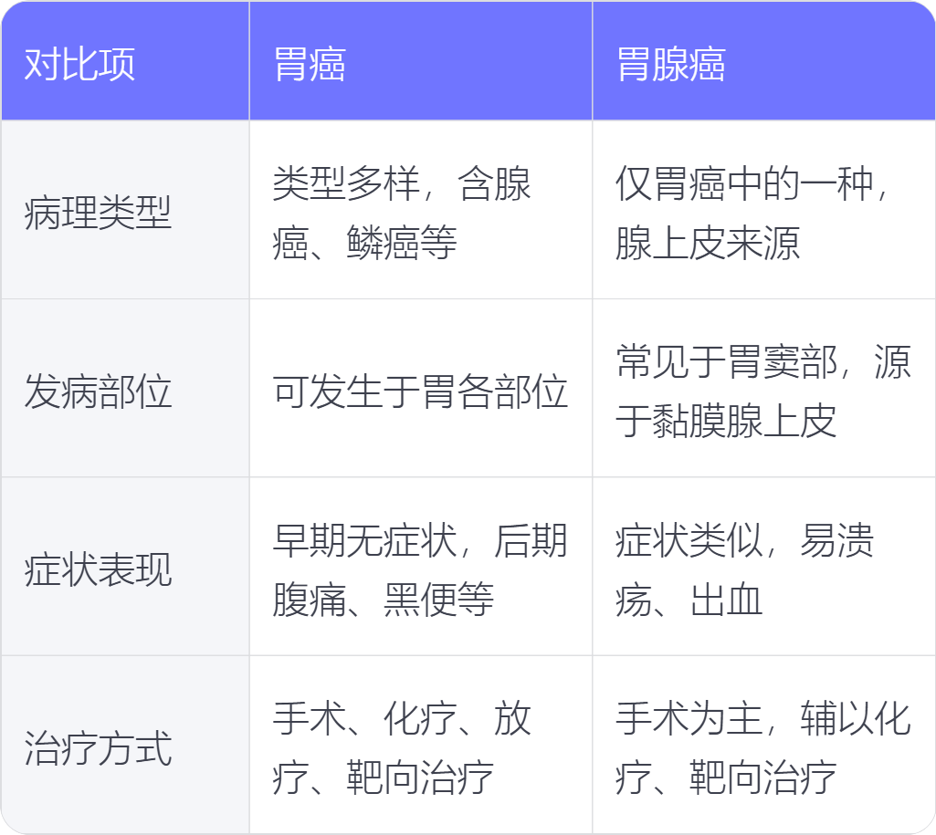 胃癌和胃腺癌在病理类型、发病部位、症状表现、治疗方式上存在不同。
