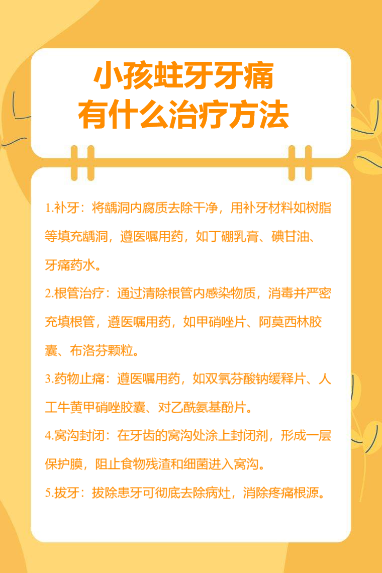 小孩蛀牙牙痛常见的治疗方法有补牙、根管治疗、药物止痛、窝沟封闭、拔牙等。