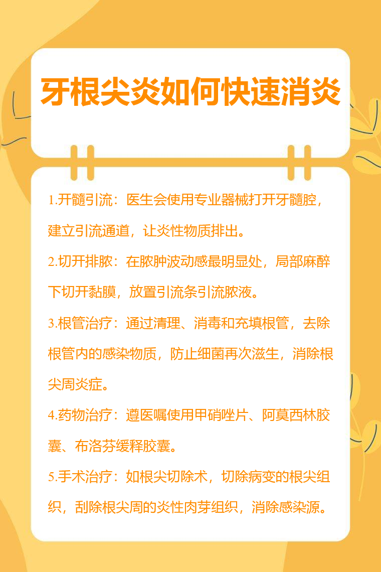 牙根尖炎快速消炎可通过开髓引流、切开排脓、根管治疗、药物治疗、手术治疗等。