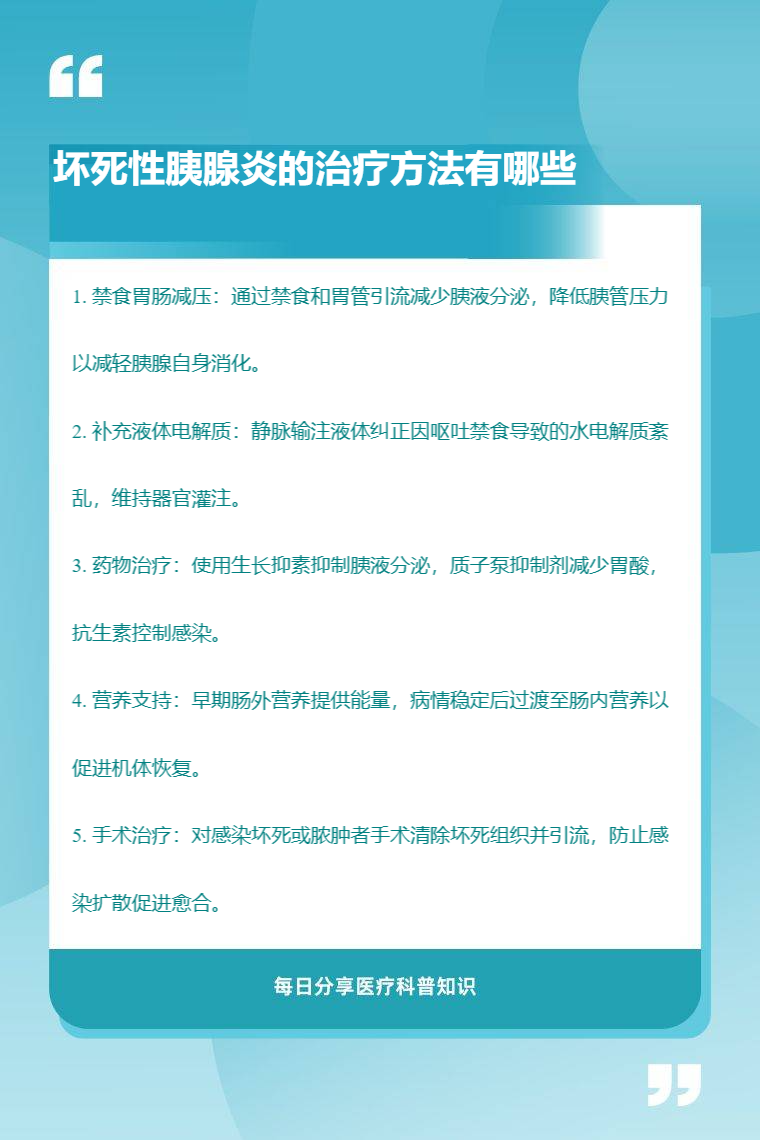 坏死性胰腺炎的治疗方法有禁食胃肠减压、补充液体电解质、药物治疗、营养支持、手术治疗等。