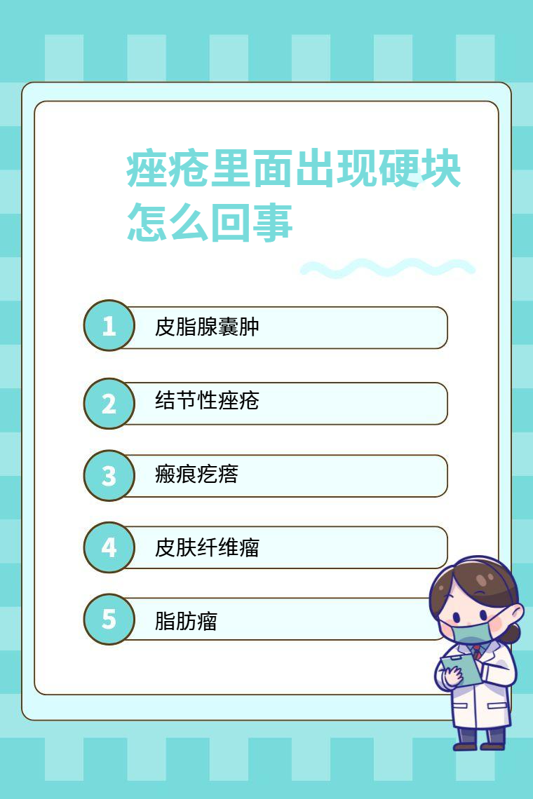 痤疮里面出现硬块,常见原因有皮脂腺囊肿、结节性痤疮、瘢痕疙瘩、皮肤纤维瘤、脂肪瘤等。