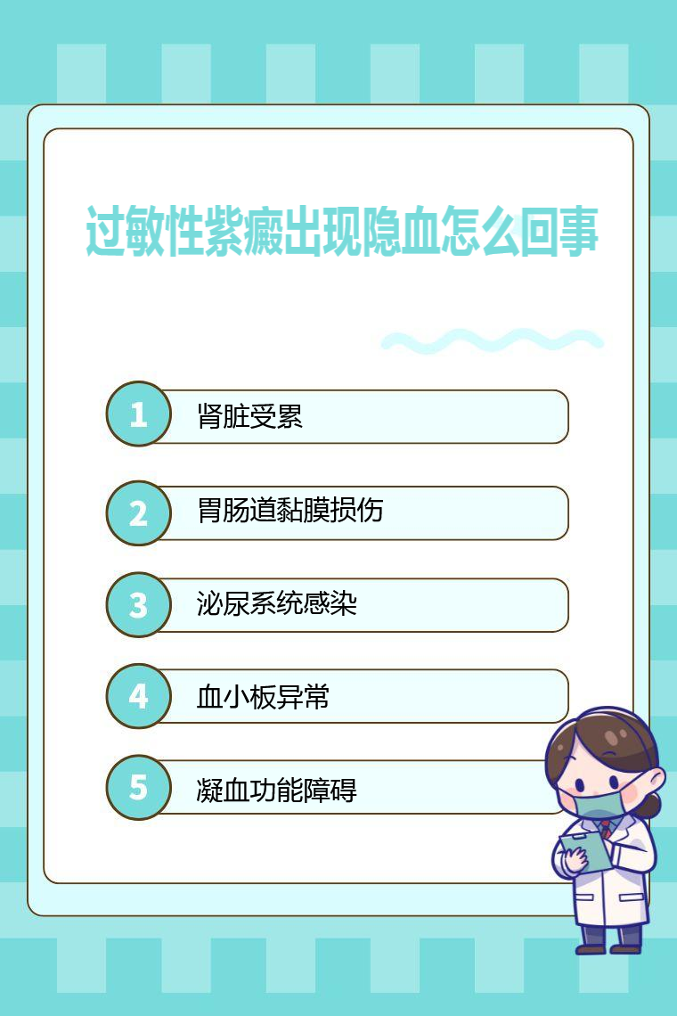 过敏性紫癜出现隐血常见原因有肾脏受累、胃肠道黏膜损伤、泌尿系统感染、血小板异常、凝血功能障碍等。