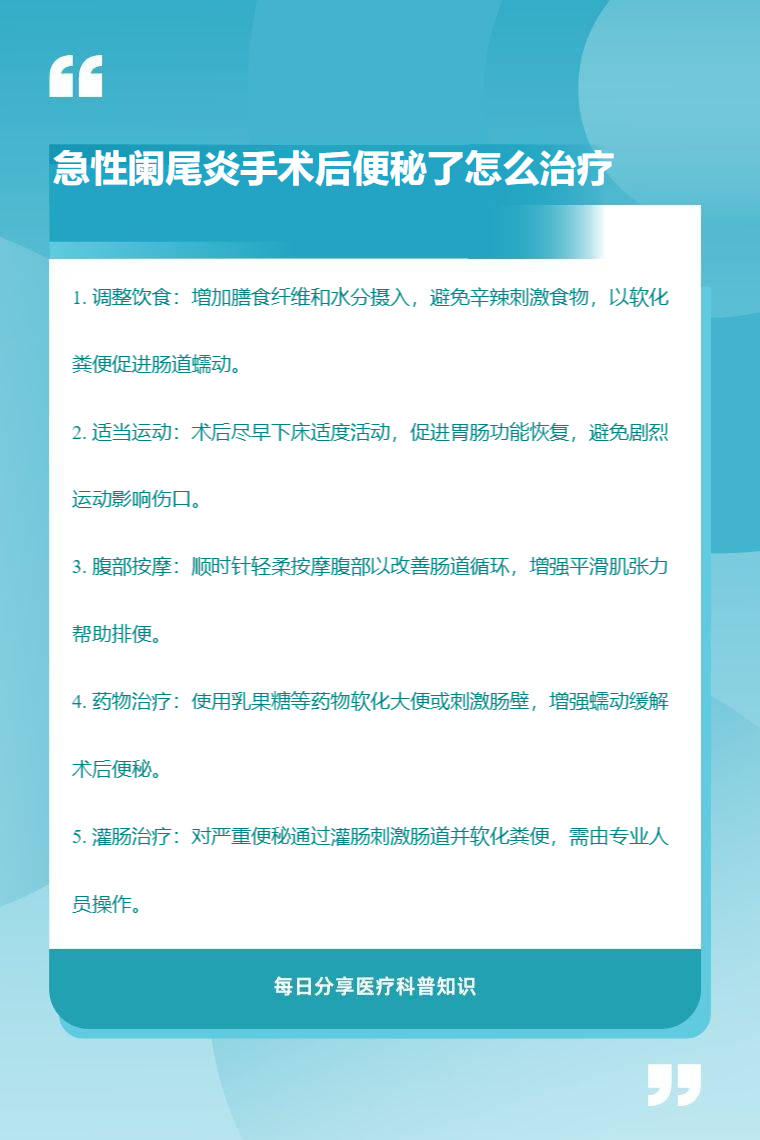 急性阑尾炎手术后便秘可通过调整饮食、适当运动、腹部按摩、药物治疗、灌肠治疗等方法来缓解。