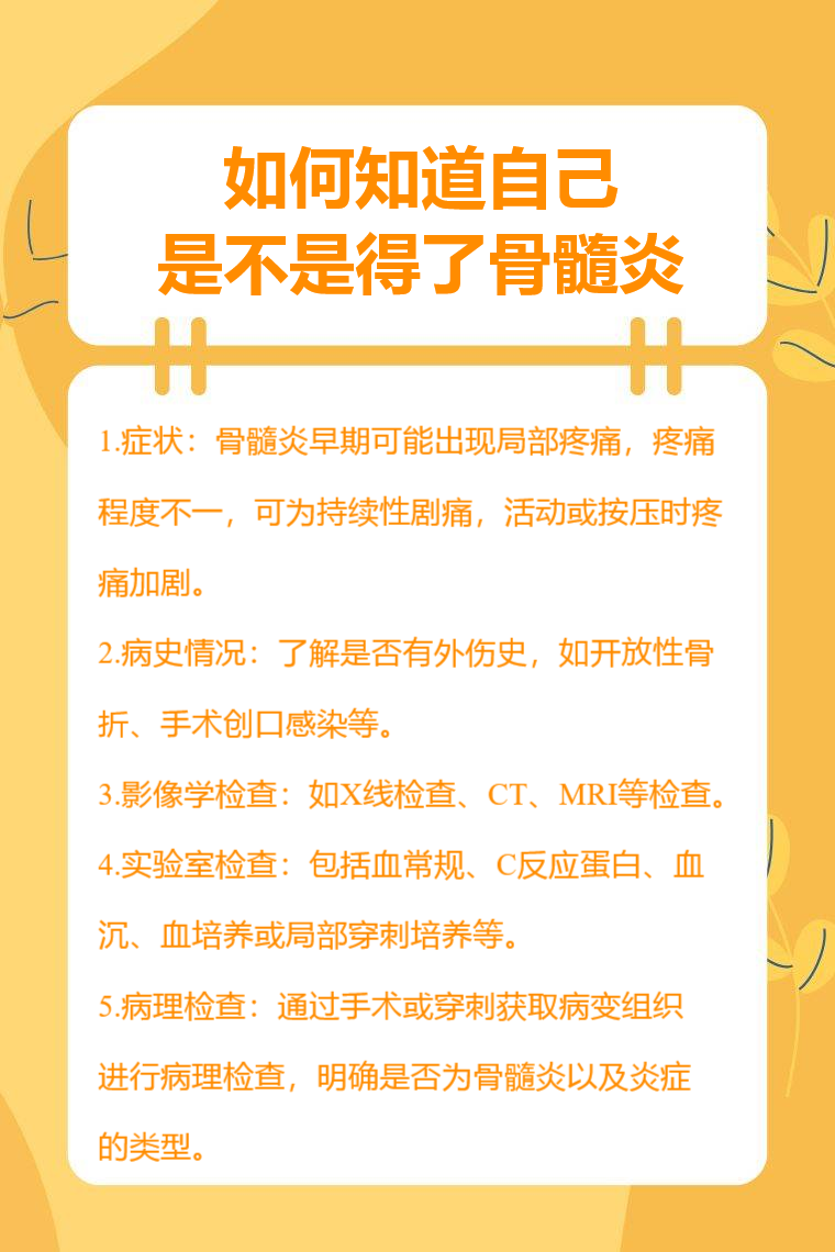 判断是否得了骨髓炎可从症状、病史情况、影像学检查、实验室检查、病理检查等方面入手。