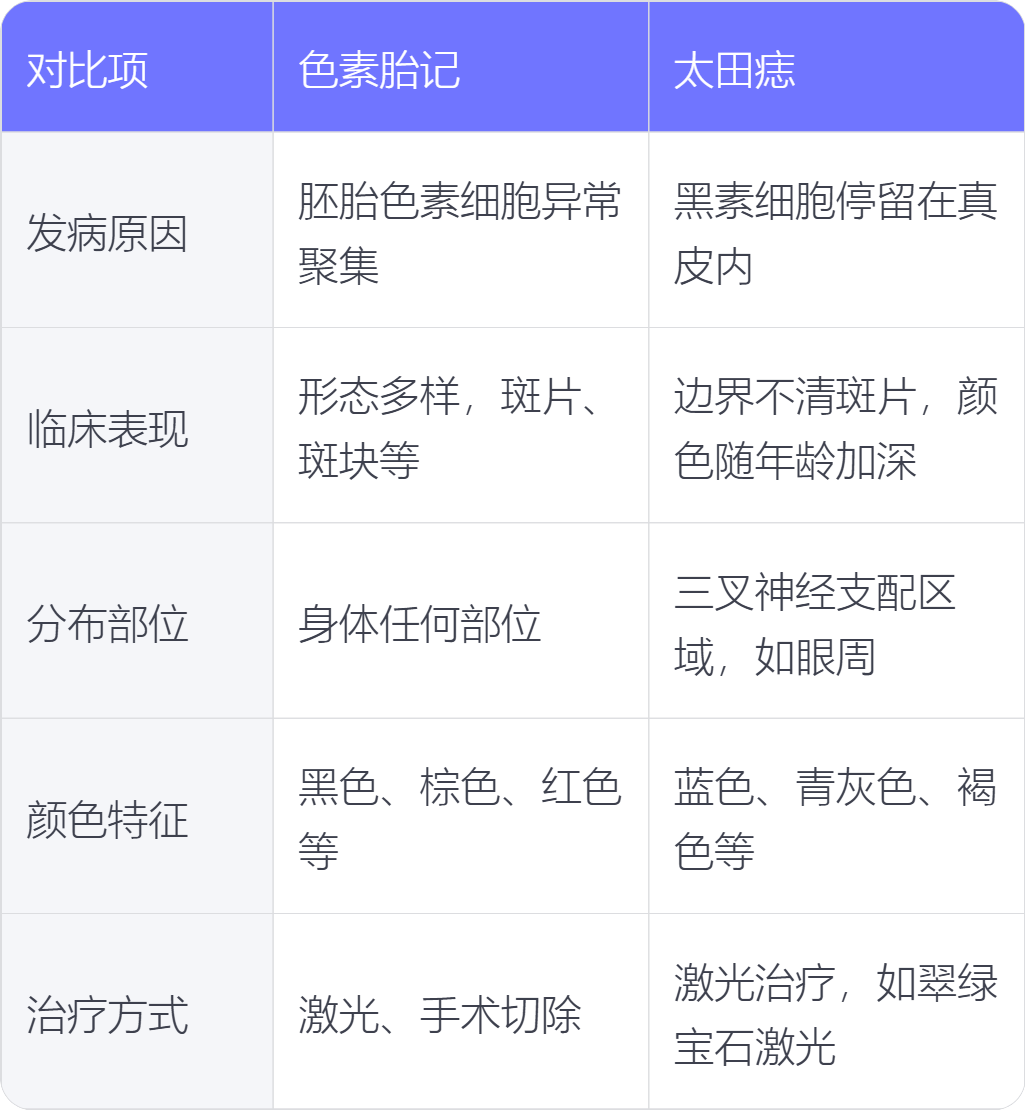 色素胎记与太田痣在发病原因、临床表现、分布部位、颜色特征、治疗方式上存在不同。