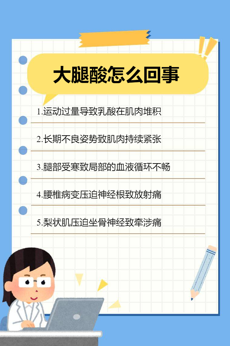 大腿酸可能是运动过量、姿势不良、着凉受寒、腰椎间盘突出、梨状肌综合征等。