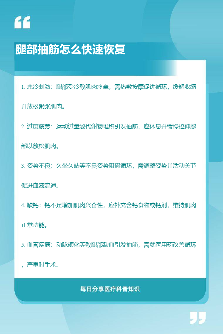 腿部抽筋可能是寒冷刺激、过度疲劳、姿势不良、缺钙、血管疾病等因素,需要针对病因治疗,可采取的方法有保暖、休息、调整姿势、补钙、治疗血管疾病等。