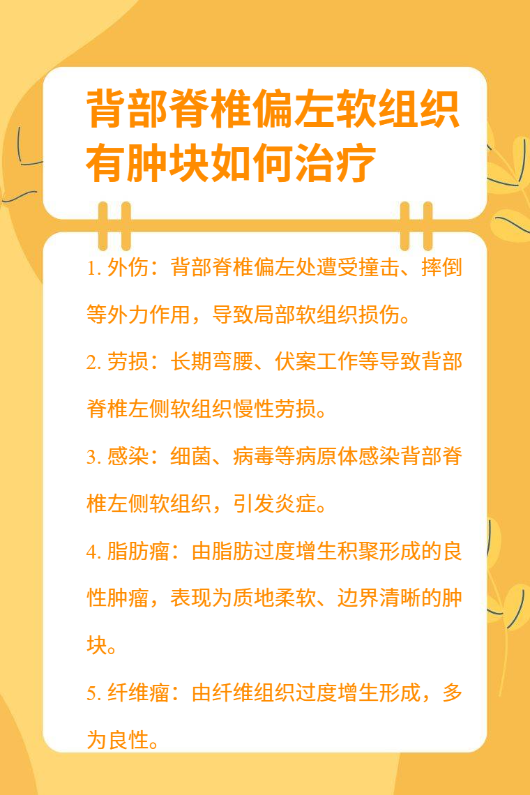 背部脊椎偏左软组织有肿块可能是外伤、劳损、感染、脂肪瘤、纤维瘤等因素,需要针对病因治疗,可采取的方法有药物治疗、手术治疗等。