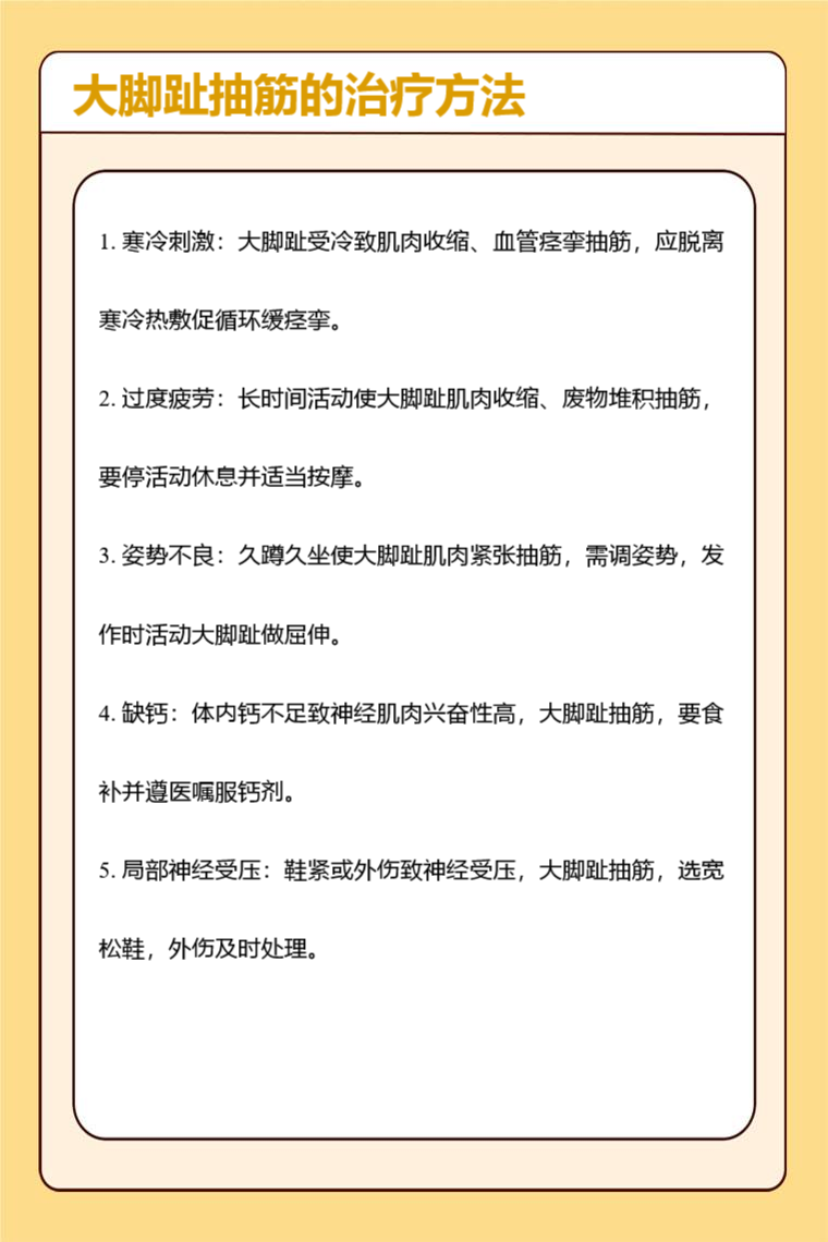 大脚趾抽筋可能是寒冷刺激、过度疲劳、姿势不良、缺钙、局部神经受压等因素,需要针对病因治疗,可采取的方法有保暖、休息、调整姿势、补钙、解除压迫等。