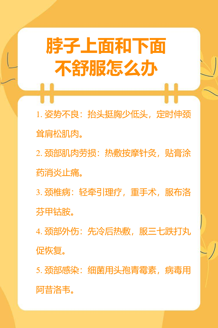脖子上面和下面不舒服可能是姿势不良、颈部肌肉劳损、颈椎病、颈部外伤、颈部感染等因素,需要针对病因治疗,可采取的方法有调整姿势、物理治疗、药物治疗等。