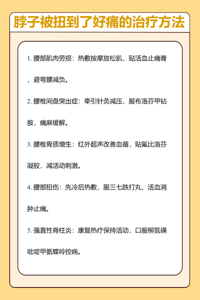 脖子被扭到好痛可能是睡眠姿势不当、颈部突然过度扭转、颈部肌肉劳损、颈椎病、颈部小关节紊乱等因素,需要针对病因治疗,可采取的方法有物理治疗、药物治疗等。