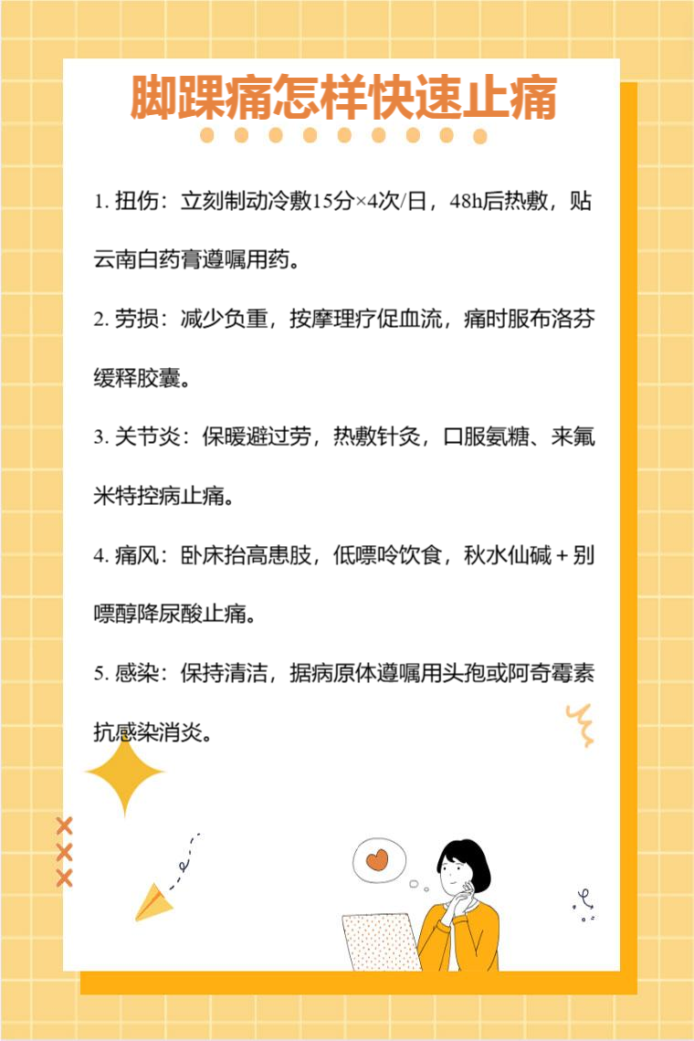 4. 痛风:因体内尿酸代谢异常,尿酸盐结晶沉积在脚踝关节引起。发作时需卧床休息,抬高患肢。饮食上严格控制嘌呤摄入,避免高嘌呤食物。遵医嘱服用秋水仙碱片、别嘌醇片、苯溴马隆胶囊等药物降低尿酸,缓解疼痛。