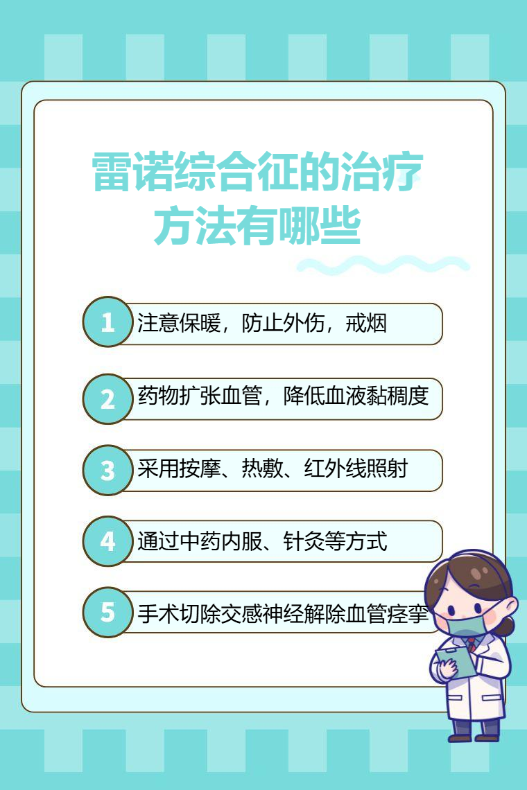 雷诺综合征的治疗方法有一般治疗、药物治疗、物理治疗、中医治疗、手术治疗等。