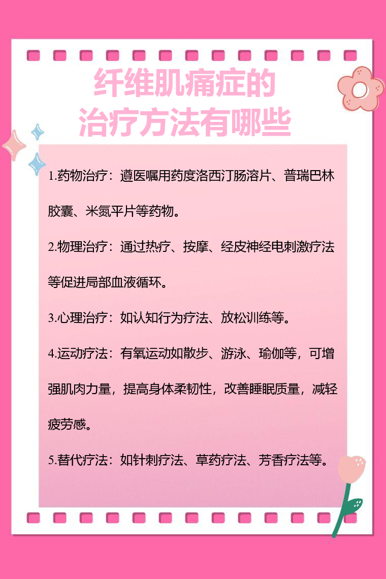 纤维肌痛症的治疗方法有药物治疗、物理治疗、心理治疗、运动疗法、替代疗法等。