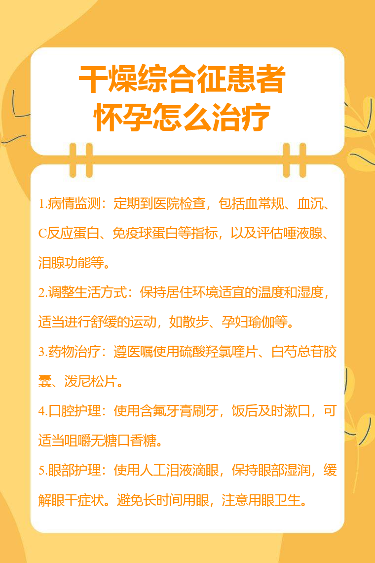 干燥综合征患者怀孕可通过病情监测、调整生活方式、药物治疗、口腔护理、眼部护理等方法进行治疗。