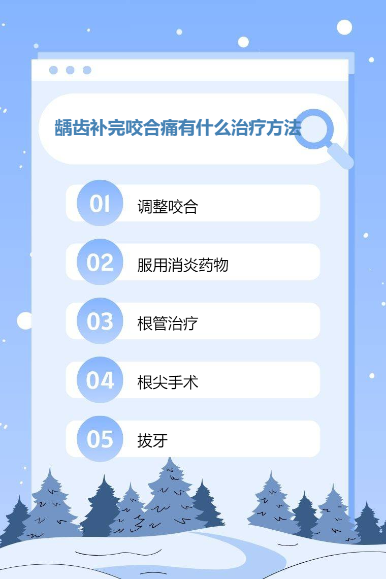 龋齿补完咬合痛可通过调整咬合、服用消炎药物、根管治疗、根尖手术、拔牙等方法治疗。