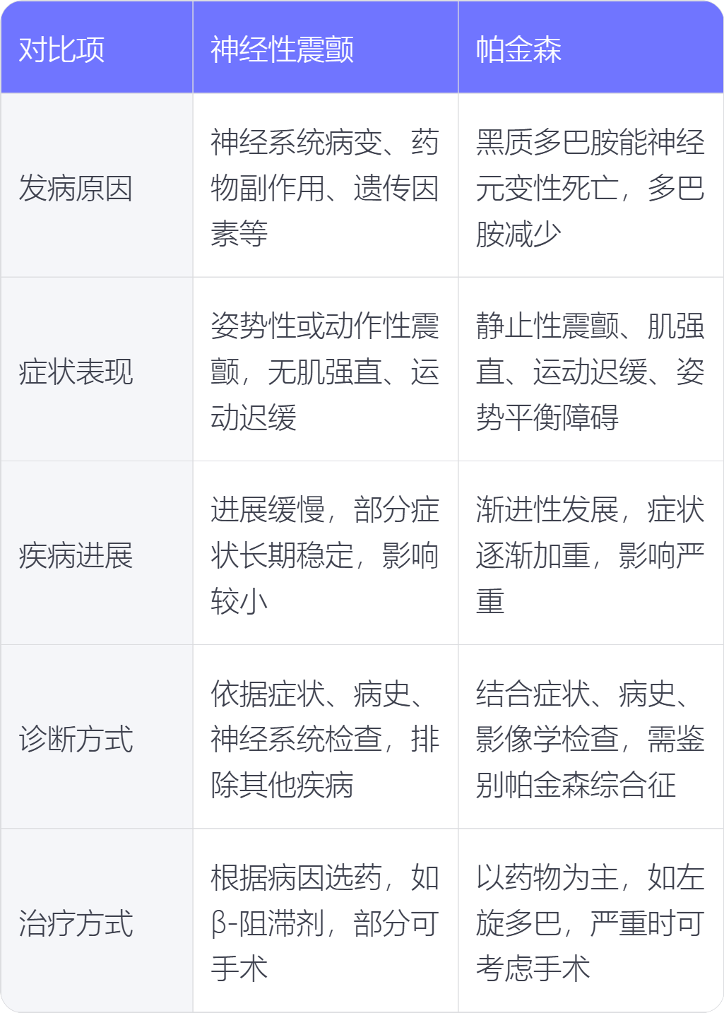 神经性震颤与帕金森在发病原因、症状表现、疾病进展、诊断方式、治疗方式上存在不同。