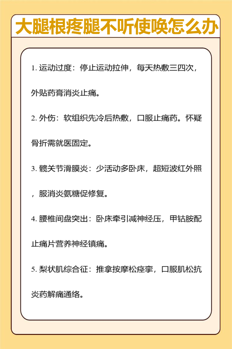 大腿根疼腿不听使唤可能是运动过度、外伤、髋关节滑膜炎、腰椎间盘突出症、梨状肌综合征等因素,需要针对病因治疗,可采取的方法有休息、药物治疗、物理治疗等。