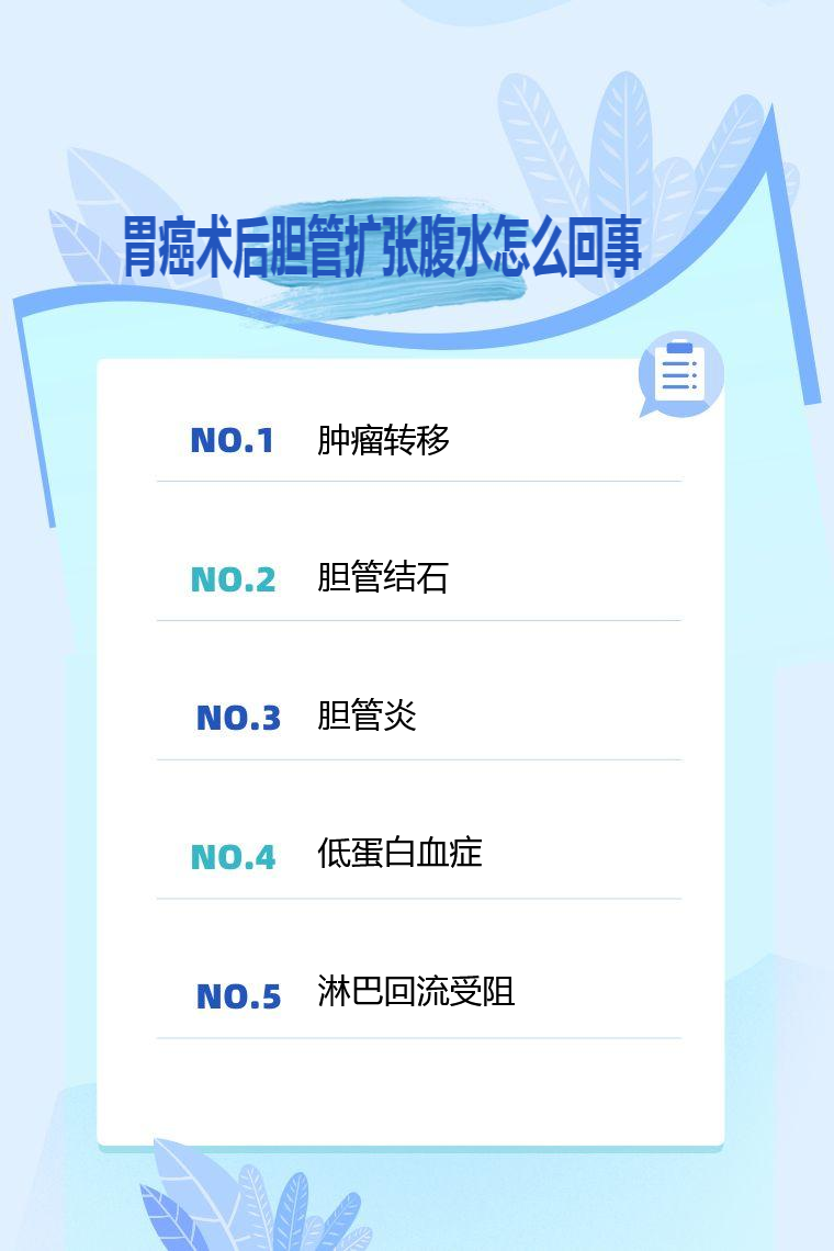 胃癌术后胆管扩张腹水可能由肿瘤转移、胆管结石、胆管炎、低蛋白血症、淋巴回流受阻等引起。