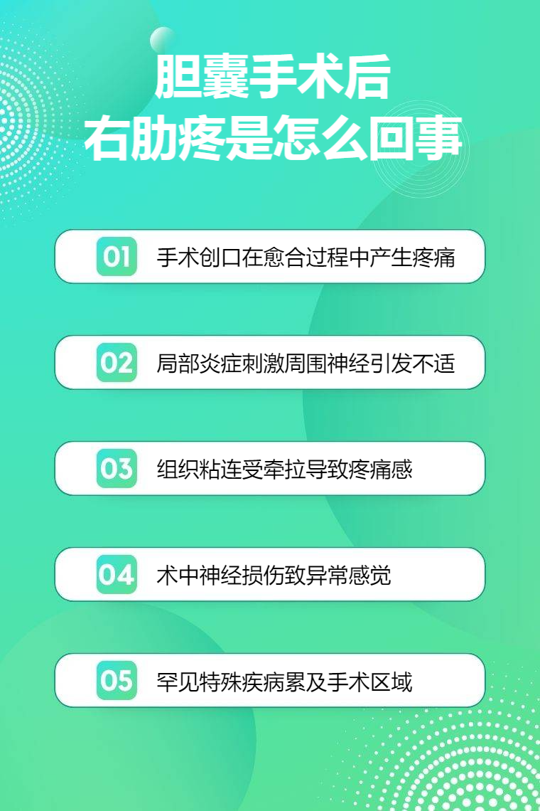 2. 炎症反应:术后局部可能出现炎症,这可能是由于手术操作引发的无菌性炎症,也可能是术后护理不当导致细菌感染引起的炎症,炎症刺激周围神经,进而导致右肋部位疼痛,通常还可能伴有发热等症状。